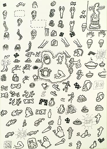 Suellen Rocca, Game Page with Bowling Trophy, c. 1968, ink on glossy paper, 12.5" x 9" Courtesy of the artist. Collection of the Pennsylvania Academy of the Fine Arts.