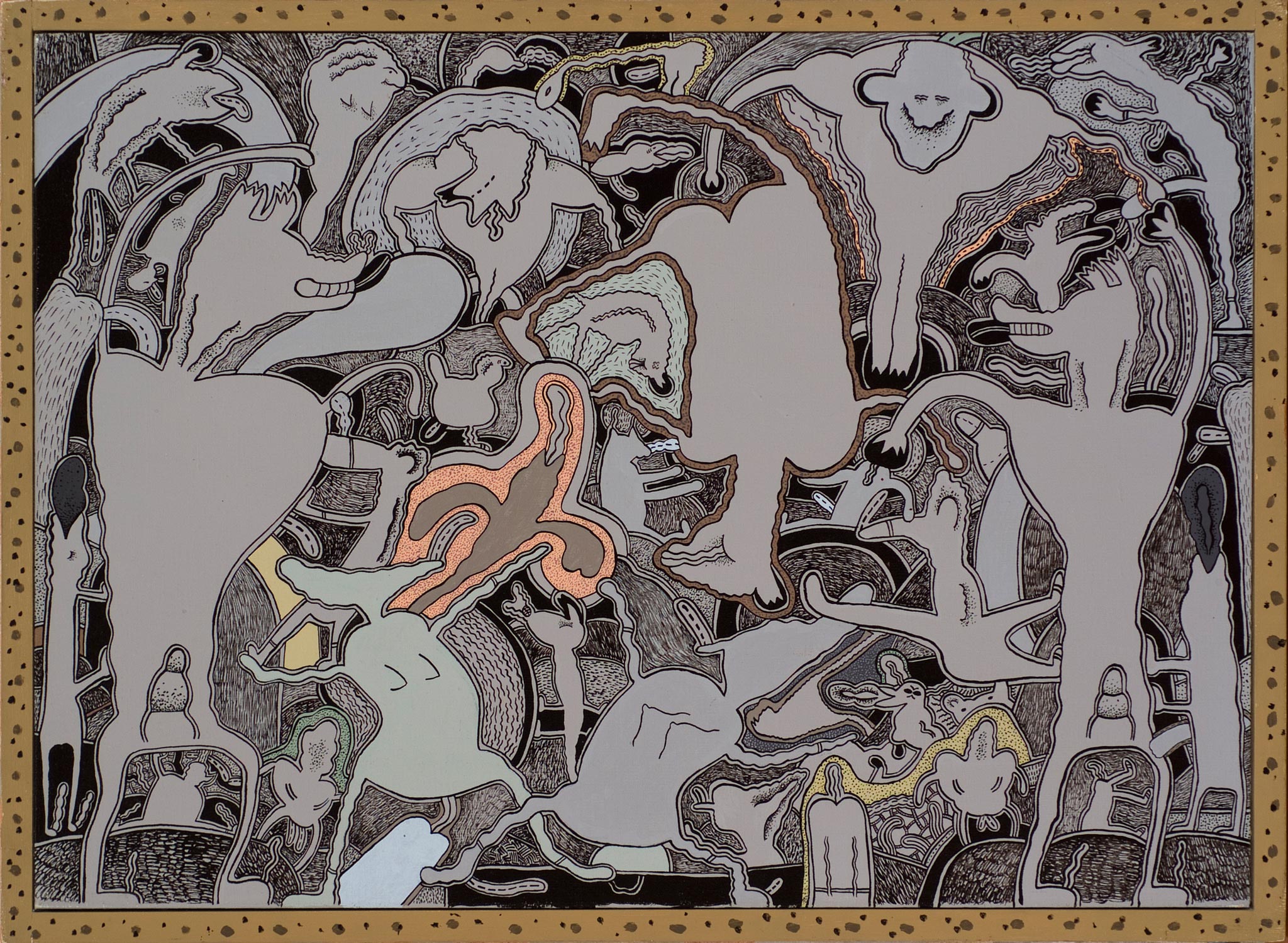 Gladys Nilsson, Semisighmetricall, 1970, acrylic on canvas with painted frame, 20.25" x 28"