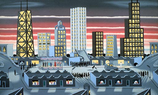 Roger Brown, The Entry of Christ Into Chicago, 1976, oil on canvas, 72" x 120" Collection of the Art Institute of Chicago. Courtesy of the Roger Brown Study Collection, the School of the Art Institute of Chicago
