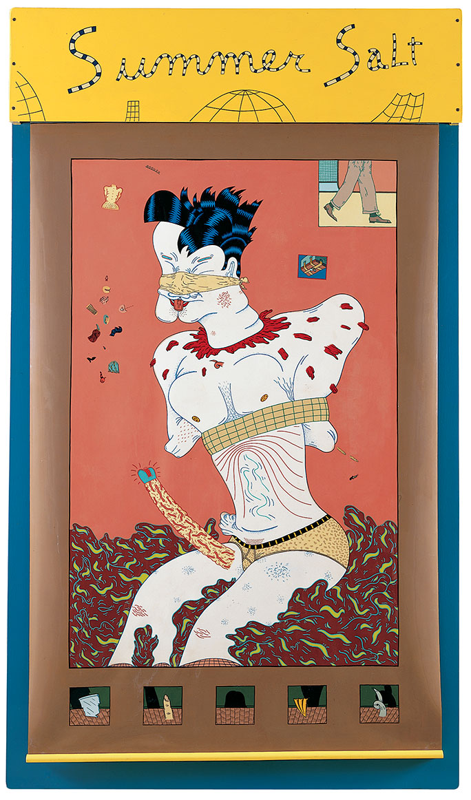 Jim Nutt, Summer Salt, 1970, acrylic on vinyl windowshade and enamel on wood frame, 66.25" x 36." Museum of Contemporary Art, Chicago, Gift of Dennis Adrian in honor of Claire B. Zeisler