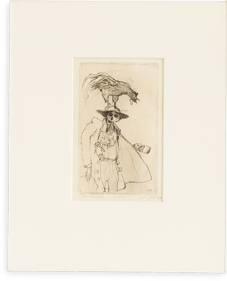 Jimmy Wright, Chicken Man, 1966, etching. The "Chicken Man" was a well-known figure around Chicago's South Side from around the 1930s until the 1970s. He performed tricks with his trained chicken and played music on a small squeezebox on streetcorners. Jimmy Wright, a friend and fellow SAIC student with many of the Imagists, became familiar with his performances on trips to Maxwell Street in the 1960s. From the Roger Brown Study Collection, the School of the Art Institute of Chicago. Photograph by Joshua Arends