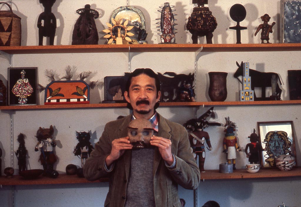 Ray Yoshida with some of his collection of Non-Western and Imagist art Photographs of Chicago Imagist Artists from 1977 by Sandra Jorgensen, Elmhurst College Art Collection, Elmhurst College, Elmhurst, IL