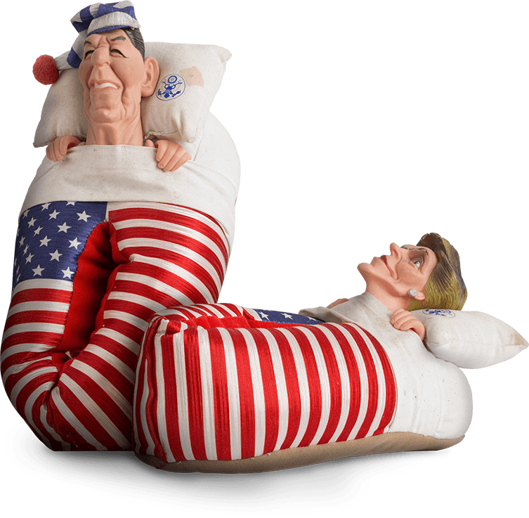 Designer unknown, Ronald and Nancy Reagan novelty bedroom slippers From the Roger Brown Study Collection, the School of the Art Institute of Chicago. Photograph by Joshua Arends