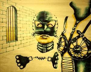 Barbara Rossi, Crucifixions by a Thread, 1983, acrylic on masonite with wood frame, 51.5" x 25.5" Courtesy of the artist