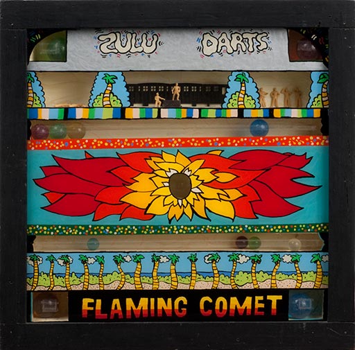 Ed Flood, The Flaming Comet Zulu Dart Board, 1968, acrylic, Plexiglas and wood, 13.5" x 13.5" x 2.5" Courtesy of the estate of the artist and Corbett vs. Dempsey