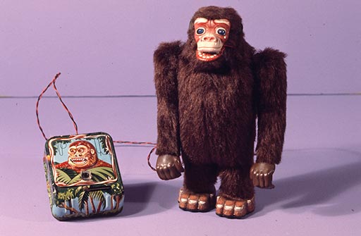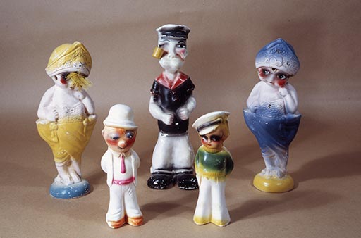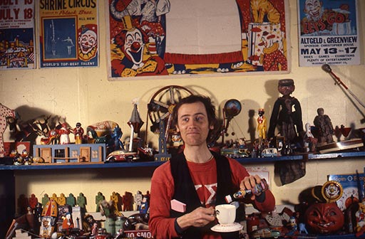 Karl Wirsum at home with his toy collection. Photographs of Chicago Imagist Artists from 1977 by Sandra Jorgensen, Elmhurst College Art Collection, Elmhurst College, Elmhurst, IL