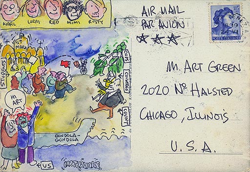 Illustrated postcard from Ed Flood and Sarah Canright while traveling in Europe Courtesy of Art Green